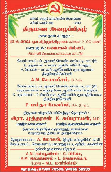 கம்யூனிஸ்ட் கட்சிகள் இங்கே எந்த அளவுக்குச் சீரழிந்து கிடக்கின்றன என்பதற்கு இந்தத்திருமண அழைப்பிதழே போதுமான சாட்சி. ஒருகாலத்தில் தங்களுடைய இலக்கு என்ன, இலக்கை அடைவதற்கான செயல்திட்டம் என்ன என்பதை தெளிவாக வரையறை செய்து வைத்திருந்த அரசியல் கட்சியாக கம்யூனிஸ்ட் கட்சி ஒன்றை மட்டுமே சொல்வது உண்டு. இலக்கையும் செயல்திட்டத்தையும் முதலில் தொலைத்தது CPI வலது கம்யூனிஸ்ட் கட்சி. சோஷலிசத்துக்கும் மம்தா பானெர்ஜிக்கும் முடிச்சுப் போடுகிற வித்தை தெரிந்தவர்கள் அவர்கள் மட்டுமே.